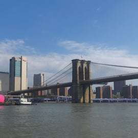 Al alejarnos del muelle, siente cómo la energía de la ciudad se transforma en un ritmo más tranquilo. Navega bajo el puente de Manhattan y pasa por el encantador paseo marítimo de DUMBO, con el carrusel de Jane girando junto a la orilla. El emblemático puente de Brooklyn se eleva sobre ti mientras el paisaje urbano se despliega a tu alrededor. Por el camino, disfruta de lugares como el histórico South Street Seaport, el ferri de Staten Island deslizándose por el puerto y el apacible paisaje verde de Governors Island.