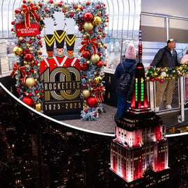 Déjate maravillar por la deslumbrante decoración navideña del Empire State Building, desde luces centelleantes hasta exposiciones fotográficas temáticas de las Rockettes inspiradas en el Radio City Christmas Spectacular